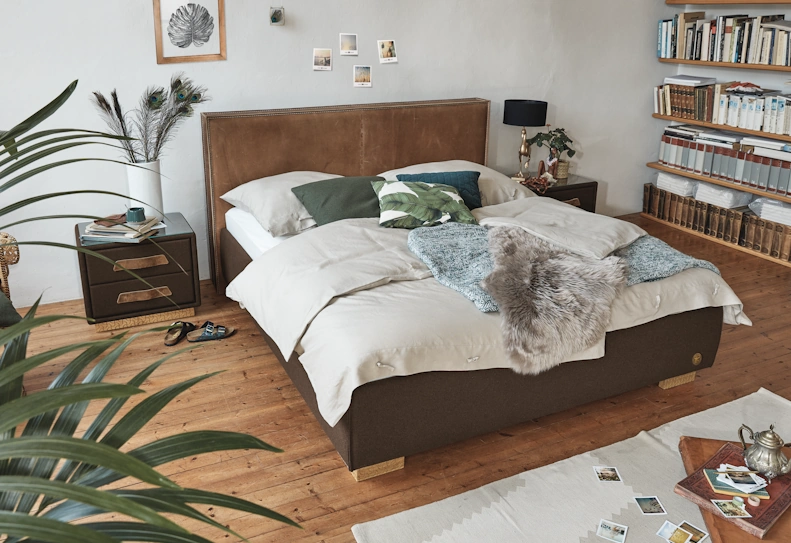 Das Boxspringbett „Canberra Advance“ überzeugt mit seiner Gradlinigkeit und robusten Look. Der Bettrahmen ist wahlweise mit Stoff oder Leder und das Kopfteil ist mit hochwertigen Sattelleder überzogen.