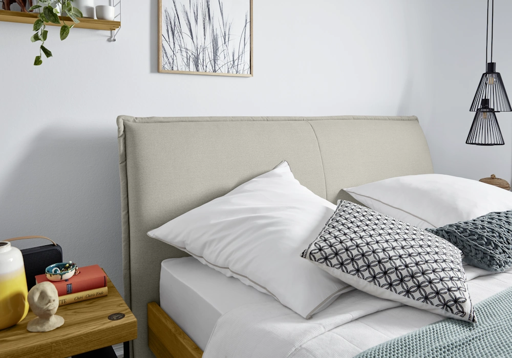 - Stoff: Kopfteil und ist mit der Stoffgruppe TBB in der Farbe beige überzogen.