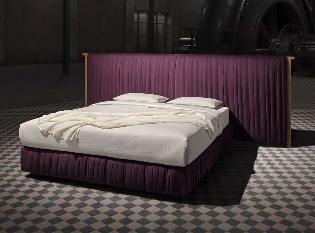 • Kopfteil: Das Kopfteil „Sipario“ ist 2-seitig gepolstert und fest bezogen. Es ist bodenstehend und hat eine Höhe von 155cm und eine Tiefe von 20cm. Der Überstand auf jeder Seite beträgt ca. 90cm